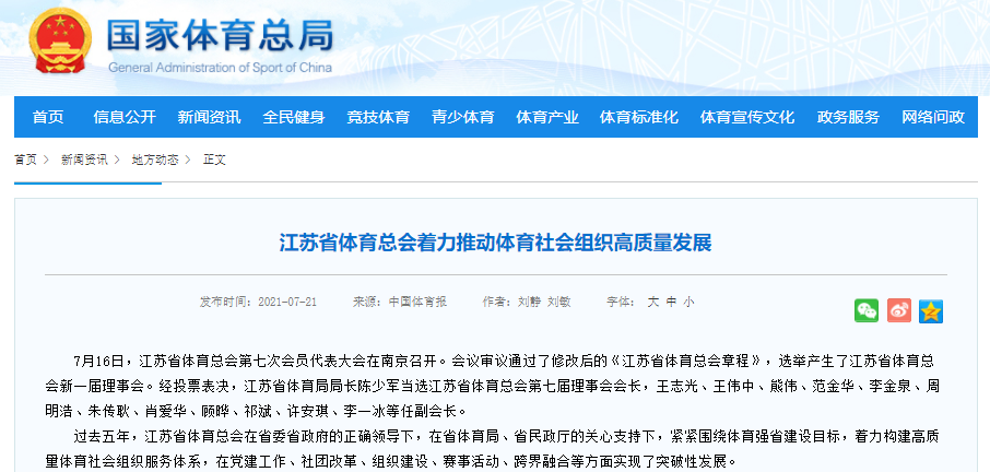 7月16日,江苏省体育总会第七次会员代表大会在南京召开。会议审议通过了修改后的《江苏省体育总会章程》,选举产生了江苏省体育总会新一届理事会。