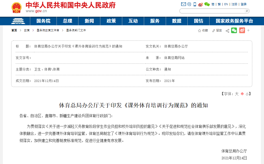 为贯彻落实《关于进一步减轻义务教育阶段学生作业负担和校外培训负担的意见》《关于促进和规范社会体育俱乐部发展的意见》,深化体教融合,进一步完善课外体育培训监管,体育总局制定了《课外体育培训行为规范》。现印发给你们,请在体育课外培训监管工作中认真贯彻落实,加快建立和完善制度标准规范,促进行业健康有序发展。