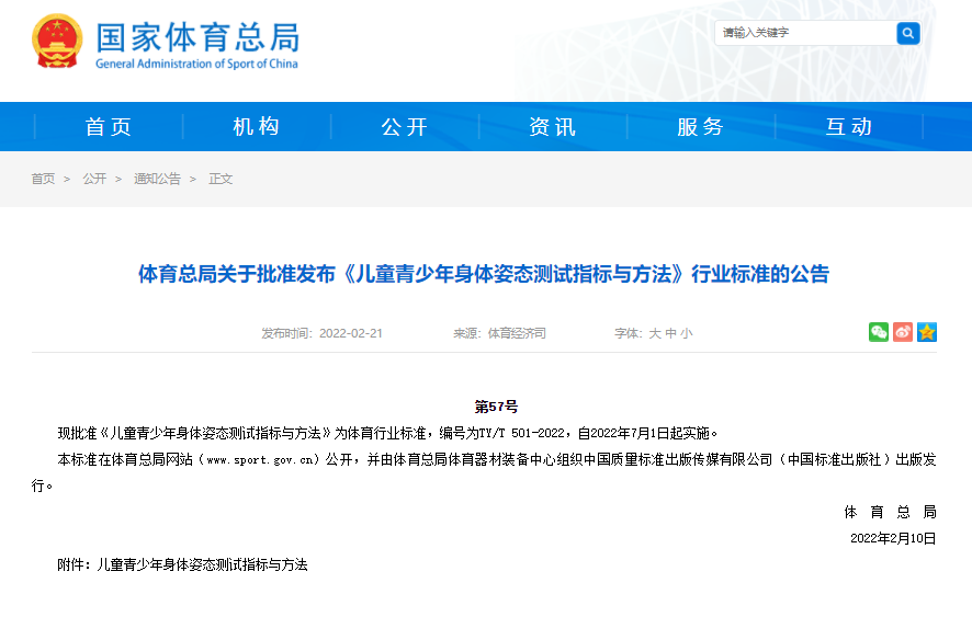 2月21日,国家体育总局批准发布《儿童青少年身体姿态测试指标与方法》为体育行业标准,编号为TY/T 501-2022。