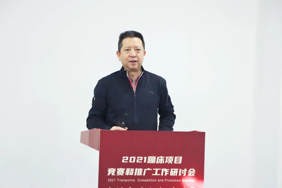 研讨会上,国家体育总局体操运动管理中心蹦床部主任贾伍华针对体操中心2020年工作实践与2021年重点工作做出详细阐述。他指出2020年,服务和保障东京奥运会备战工作仍是中心的重点业务,在疫情下排除困难从赛事组织、科研保障、裁判管理、信息服务等方面主动出击,满足队伍的备战需求,为国家队竞技水平的提升提供了多重保障。2020年体操中心在蹦床项目的竞赛组织方面也做出了很多切实有效的探索与实践,并于2020年6月正式下发《关于印发中国蹦床与技巧协会蹦床项目办赛指南、参赛指引的通知》,为新时期更好开展蹦床项目竞赛提供了依据。他强调,要推动蹦床项目科学有序高质量发展,也要认清当前项目推广过程中存在的问题,目前蹦床项目赛事与群众体育项目赛事发展差距还很大,2021年要全面提升蹦床赛事的现场感官体验,引入市场资源,与企业、俱乐部共同探索创新发展方式和竞赛产品、锻炼产品,将蹦床赛事推向更广泛受众。 在推进蹦床项目在全国落地推广方面,以大众蹦床技术等级体系和蹦床操项目为抓手,通过举办蹦床操赛事和蹦床通级赛,帮助省级、地市级蹦床协会和体育管理部门、教育管理部门发展蹦床项目和大众蹦床项目,促进地区蹦床项目的体教融合,并举行举办全国蹦床裁判技术加强培训班,培养更多的专业裁判人才,为高水平竞技队伍发现和输送人才奠定基础。