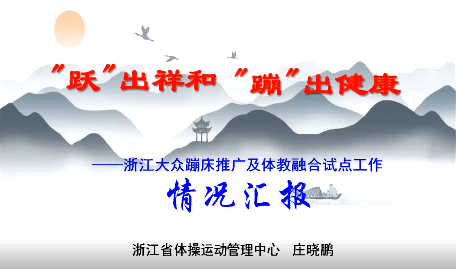 连线分享中,浙江体育职业技术学院体操系主任庄晓鹏则聚焦体教融合,针对浙江大众蹦床推广及体教融合试点工作进行了经验分享与交流,就十四五规划中蹦床运动推广内容和目标进行了阐述。庄晓鹏结合浙江积极探索发展镇海“全国蹦床运动实验区”,探索发展“全国大众蹦床体教融合示范学校”、“全国大众蹦床体教融合示范幼儿园”,创建“全国蹦床运动示范区”的实践,为全国蹦床运动持续深入发展提供镇海方案、镇海样板,他表示下步拟通过进一步强化蹦床工作考核、积极承办国内外高水平赛事、培育蹦床体育产业三方面重点工作,形成以地方政府为引导,学校全面实施,社会广泛参与的良好发展态势,达到区域性蹦床项目普及全覆盖;并在积极探索发展的基础上,进行蹦床课程模式的建立与内涵挖掘、项目资源的挖掘与安全保障、评价体系的构建与数据分析、体育俱乐部的试点与合作创新、师资队伍的稳定与专业发展的研究,形成具有浙江省特色的体教融合大众蹦床发展模式。以此加快改善提升地方体育场馆设施建设,为实施竞技体育争光和推动“健康浙江”建设创造必备条件。努力实现将浙江蹦床成为中国蹦床展示的“重要窗口”。