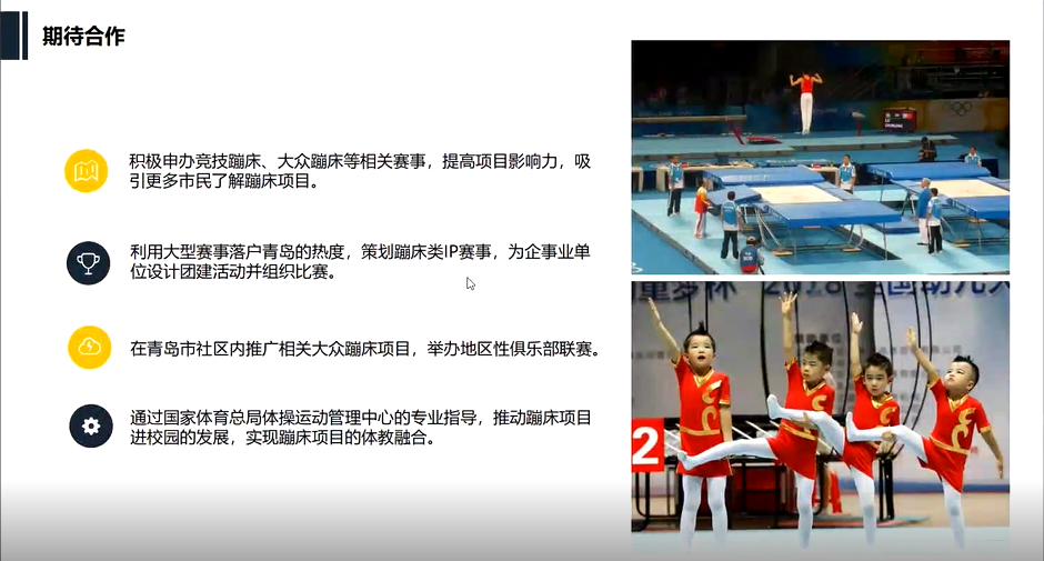 青岛国信文化体育产业有限公司则在现场着重分享了其依托国信体育中心积极承办各类大型赛事的经验,尤其是疫情后赛事举办经验。国信文体先后承办过第11届全运会、苏迪曼杯世界羽毛球锦标赛、 世界柔道大师赛、全国游泳冠军赛、全国短道速滑锦标赛、CBA 联赛和中甲联赛等各类大型赛事超500场,现场青岛国信冯城雯也表示希望通过这些成功办赛的经验,积极申办国家体育总局体操运动管理中心主办的大众类、竞技类体育赛事,提高项目影响力;并利用大型赛事落户青岛的热度,策划体操、艺术体操、蹦床等IP 赛事,为企事业单位设计团建活动并组织比赛,推进蹦床体操运动在青岛的落地推广,并在青岛市社区内推广相关大众类项目,举办地区性俱乐部联赛,同时推进蹦床进校园。